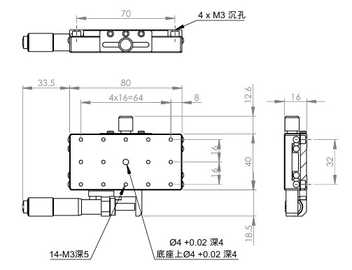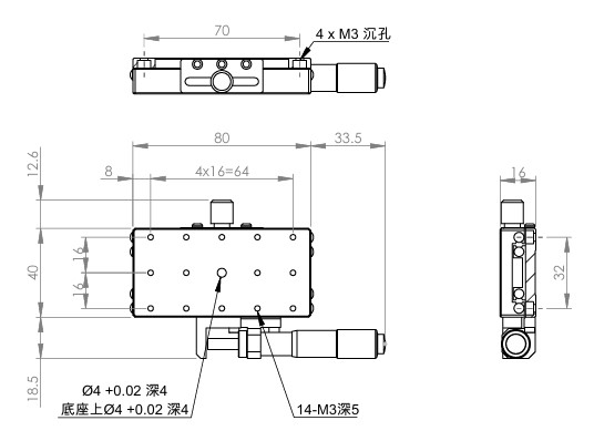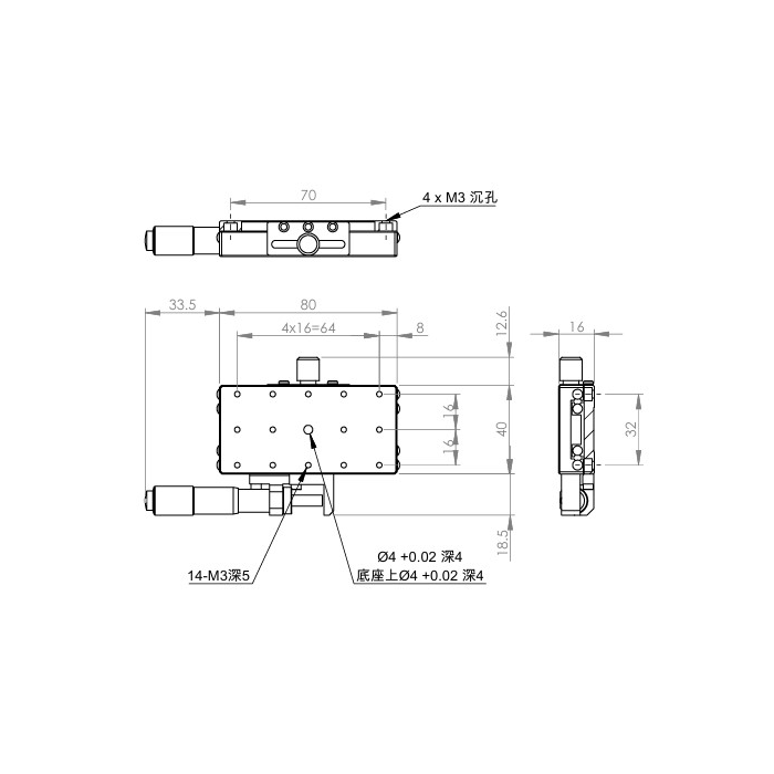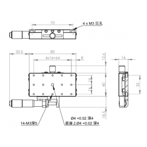 長方形設計,增加移動行程 材質:SUS440C不鏽鋼,表面鍍無電解鎳 檯面尺寸:40 x 80 mm 厚度:16 mm 行程:25 mm 驅動方式:分厘卡頭 讀取精度:0.01mm 荷重:10 kgf 重量:0.4 kg 型號: STS4080AL 分厘卡頭位在左側 STS4080AR 分厘卡頭位在右側