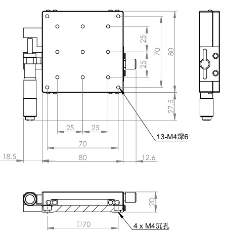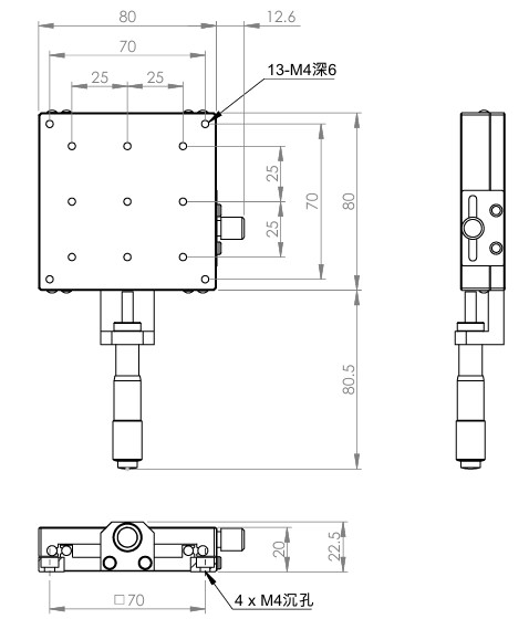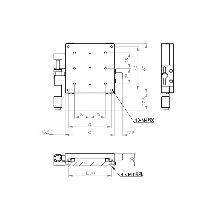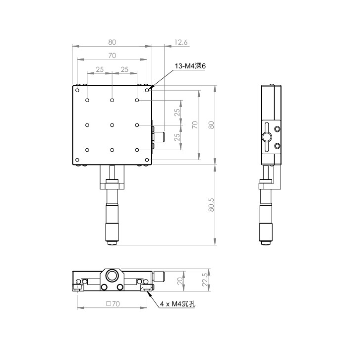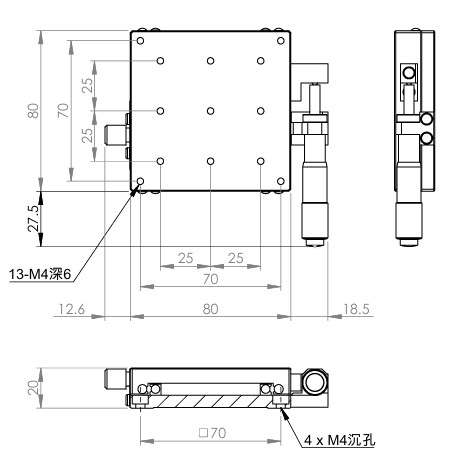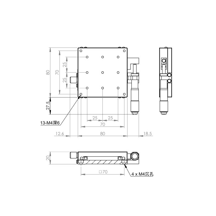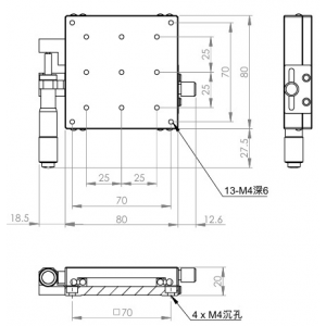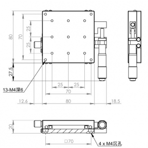 材質:SUS440C不鏽鋼,表面鍍無電解鎳 檯面尺寸:80 x 80 mm 厚度:20 mm 行程:25 mm 驅動方式:分厘卡頭 讀取精度:0.01mm 荷重:27 kgf 重量:0.9 kg 型號: STS80AC 分厘卡頭位在中心 STS80AL 分厘卡頭位在左側 STS80AR 分厘卡頭位在右側