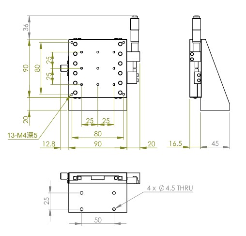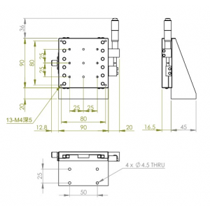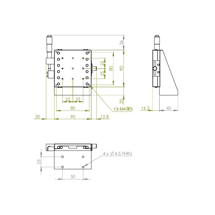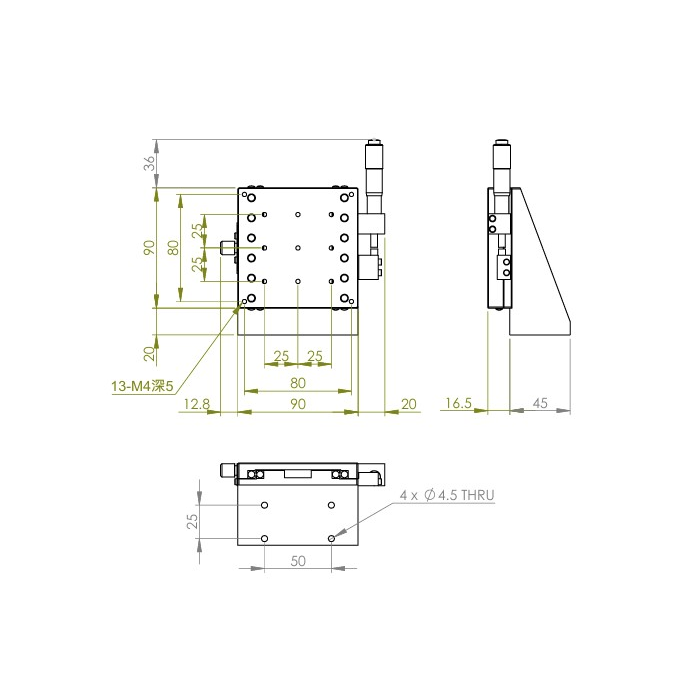 垂直升降,防墜設計 材質:鋁合金黑色陽極處理 檯面尺寸:90 x 90 mm 行程:25 mm 驅動方式:分厘卡頭 讀取精度:0.01 mm 偏移量:10 µm 荷重:6 kgf 重量:0.88 kg 型號: STV90AC 分厘卡頭位在中心 STV80AL 分厘卡頭位在左側 STV80AR 分厘卡頭位在右側