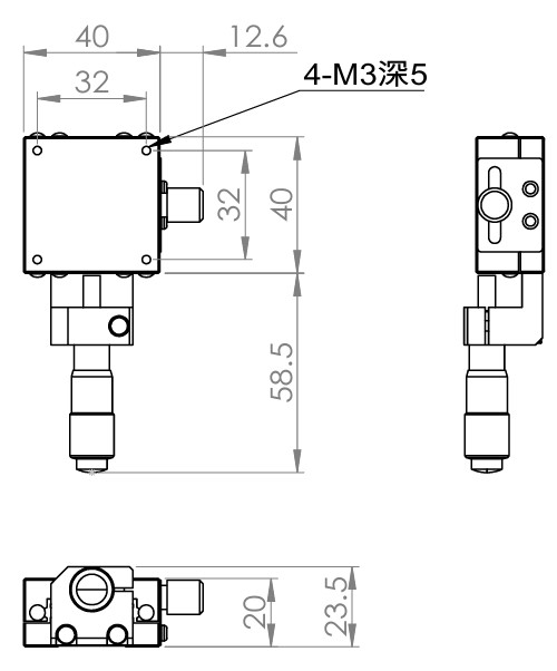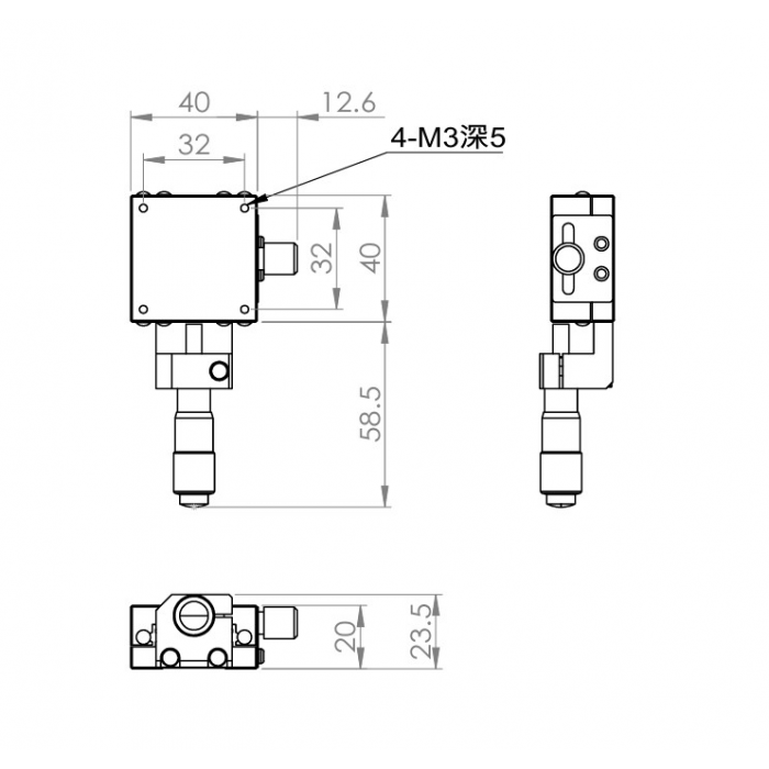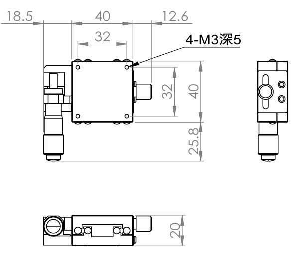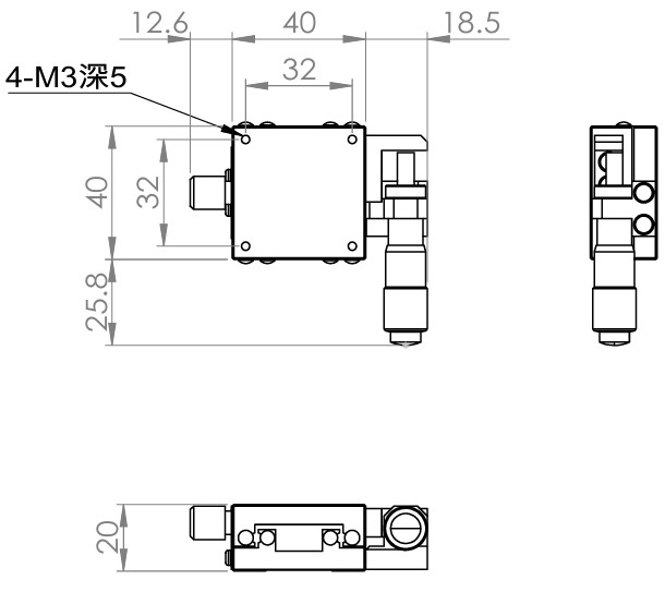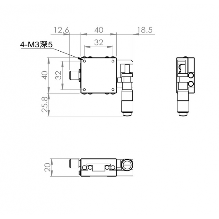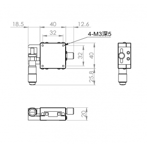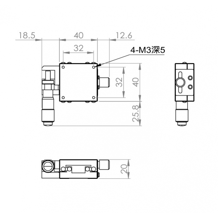 極簡化孔位,簡易型設計,降低加工成本 材質:SUS440C不鏽鋼,表面鍍無電解鎳 檯面尺寸:40 x 40 mm 厚度:20 mm 行程:13 mm 驅動方式:分厘卡頭 讀取精度:0.01mm 荷重:10 kgf 重量:0.23 kg 型號: STS40AC-H 分厘卡頭位在中心 STS40AL-H 分厘卡頭位在左側 STS40AR-H 分厘卡頭位在右側
