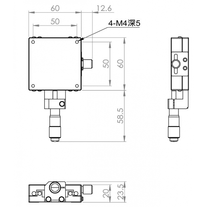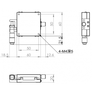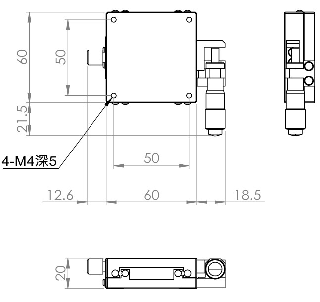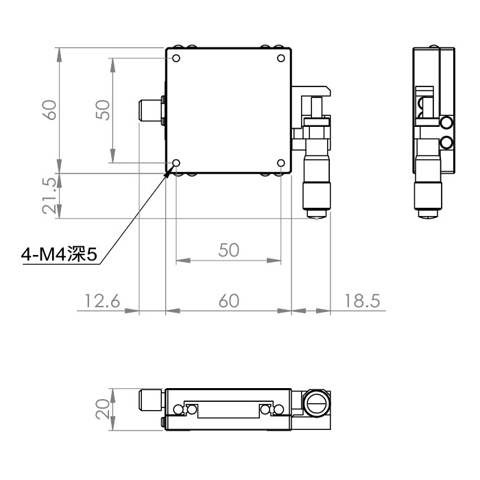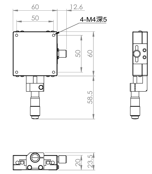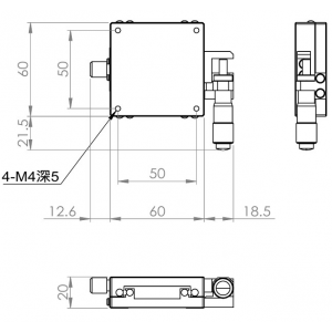 極簡化孔位,簡易型設計,降低加工成本 材質:SUS440C不鏽鋼,表面鍍無電解鎳 檯面尺寸:40 x 40 mm 厚度:20 mm 行程:13 mm 驅動方式:分厘卡頭 讀取精度:0.01mm 荷重:20 kgf 重量:0.47 kg 型號: STS60AC-H 分厘卡頭位在中心 STS60AL-H 分厘卡頭位在左側 STS60AR-H 分厘卡頭位在右側