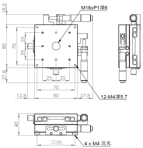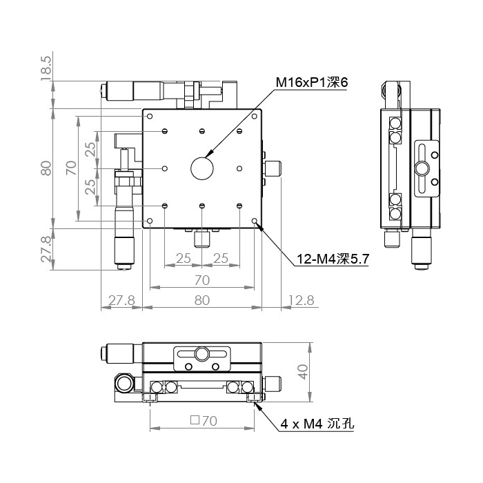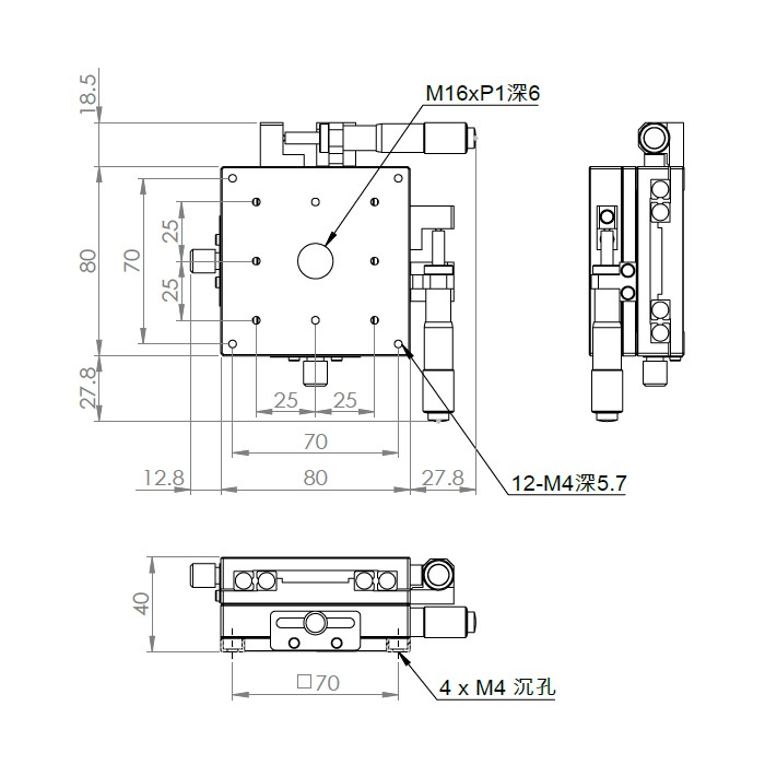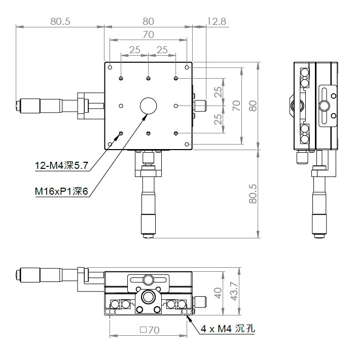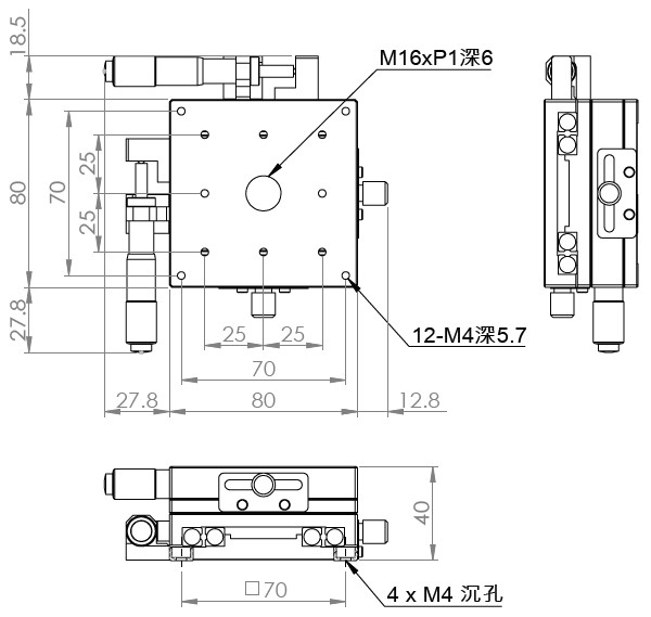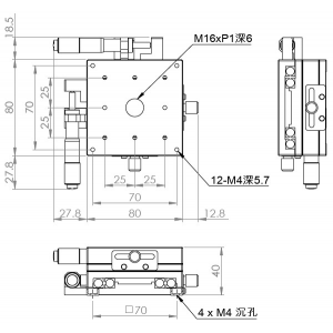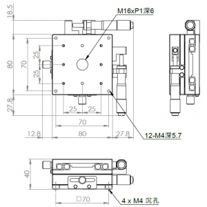 材質:鋁合金黑色陽極處理 檯面尺寸:80 x 80 mm 厚度:40 mm 行程:25 mm 驅動方式:分厘卡頭 讀取精度:0.01mm 平行度:0.06mm 荷重:10 kgf 重量:0.9 kg 型號: ST280AC 分厘卡頭位在中心 ST280AL 分厘卡頭位在左側 ST280AR 分厘卡頭位在右側