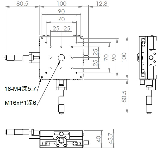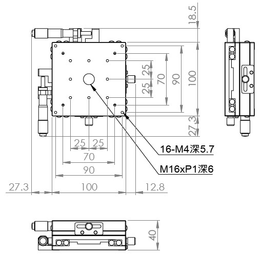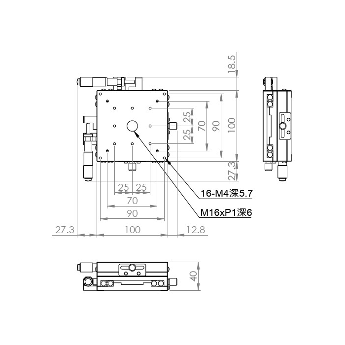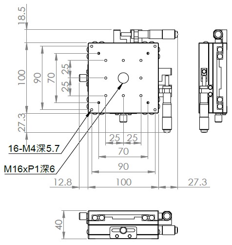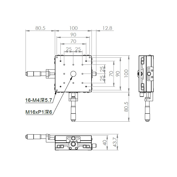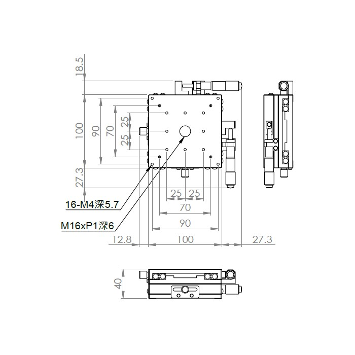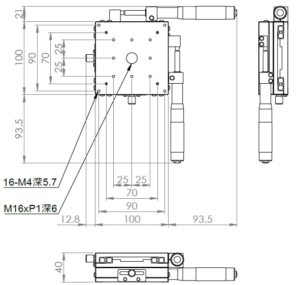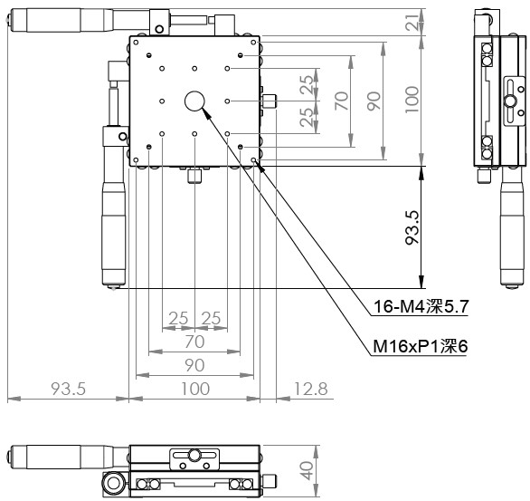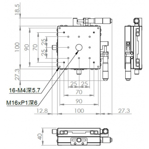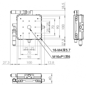 材質:鋁合金黑色陽極處理 檯面尺寸:100 x 100 mm 厚度:40 mm 行程:25 mm / 50 mm 驅動方式:分厘卡頭 讀取精度:0.01mm 平行度:0.06mm 荷重:10 kgf 重量:1.28 kg / 1.68 kg 型號: 行程25mm ST2100AC 分厘卡頭位在中心 ST2100AL 分厘卡頭位在左側 ST2100AR 分厘卡頭位在右側 行程50mm ST2100AL-50 分厘卡頭位在左側 ST2100AR-50 分厘卡頭位在右側