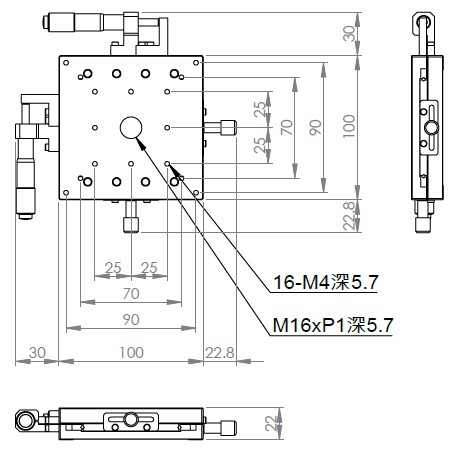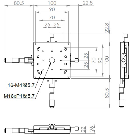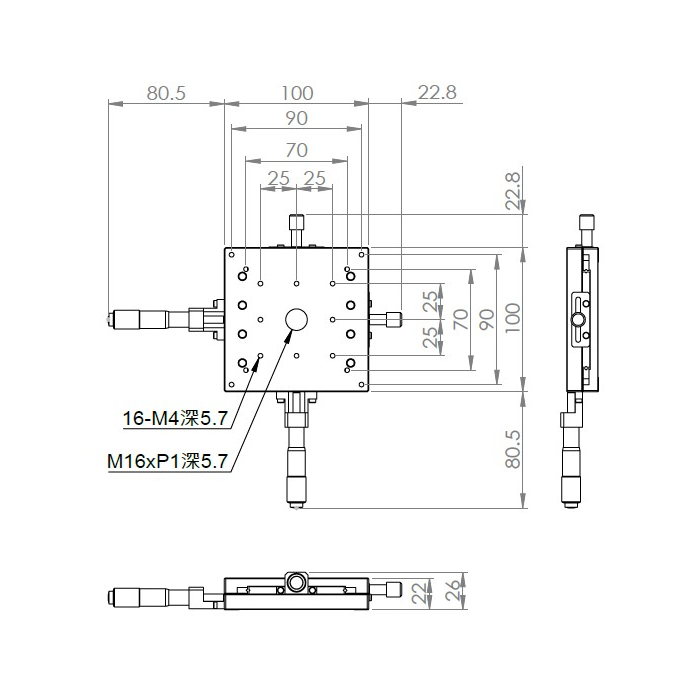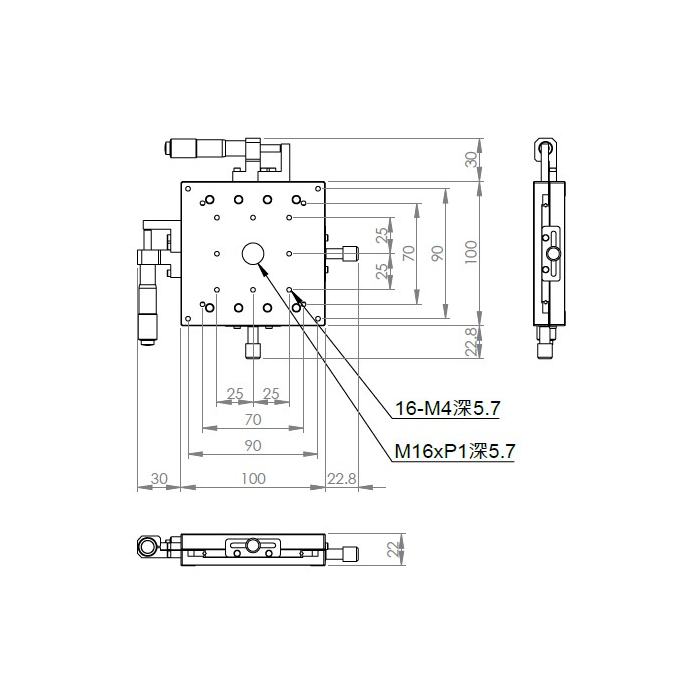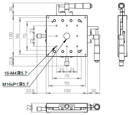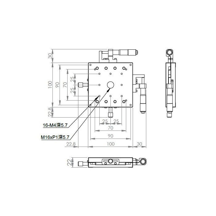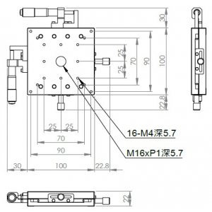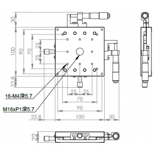 超薄XY軸一體型設計 材質:鋁合金黑色陽極處理 檯面尺寸:100 x 100 mm 厚度:22 mm 行程:25 mm 驅動方式:分厘卡頭 讀取精度:0.01mm 平行度:0.06mm 荷重:4 kgf 重量:0.96 kg 型號: ST2100ACU 分厘卡頭位在中心 ST2100ALU 分厘卡頭位在左側 ST2100ARU 分厘卡頭位在右側