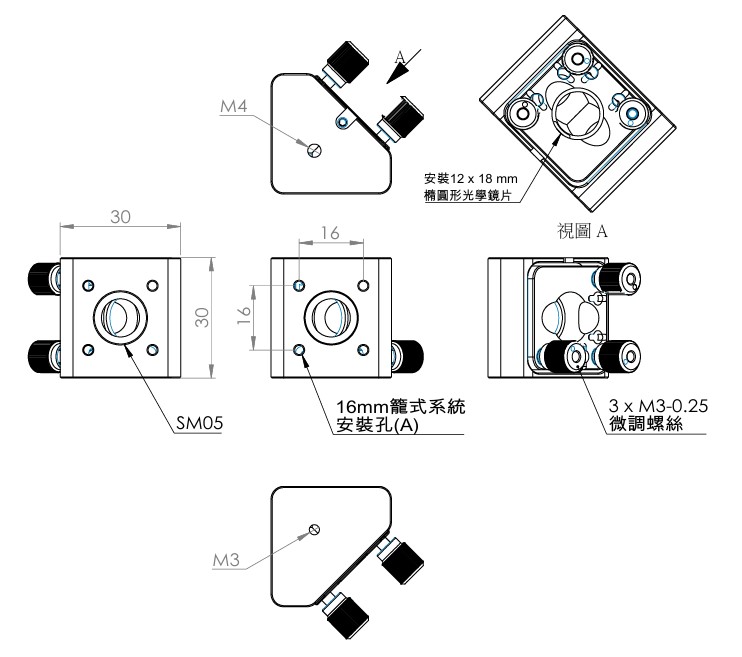 16 mm同軸系統直角反射鏡架適用於45°安裝尺寸12x18mm的橢圓形反射鏡,橢圓形鏡片相較於圓形鏡片有較大的通光口徑。