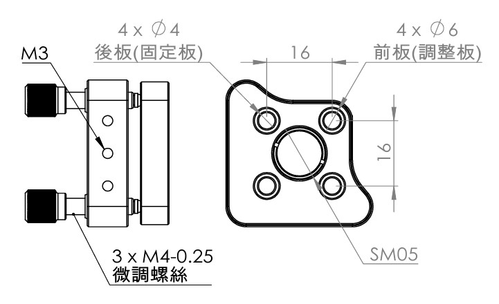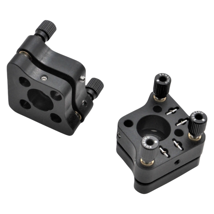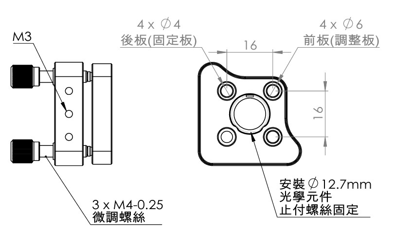 16mm0°入射調整架相容於16 mm同軸系統,適用於同軸系統中Ø12.7 mm反射鏡的安裝及調節,有止付螺絲固定和鏡片固定環固定兩種方式。