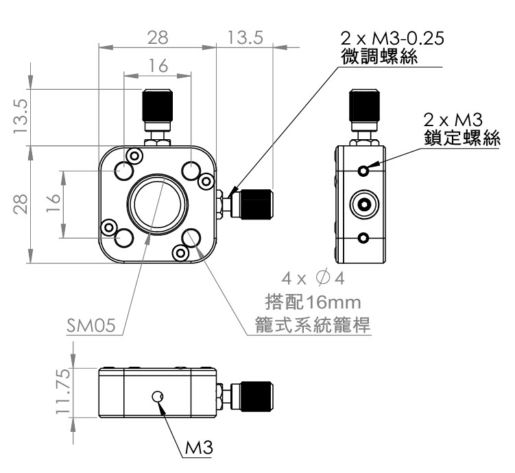 - 適用0.5吋(12.7mm)光學元件,直接安裝最大厚度5.6mm