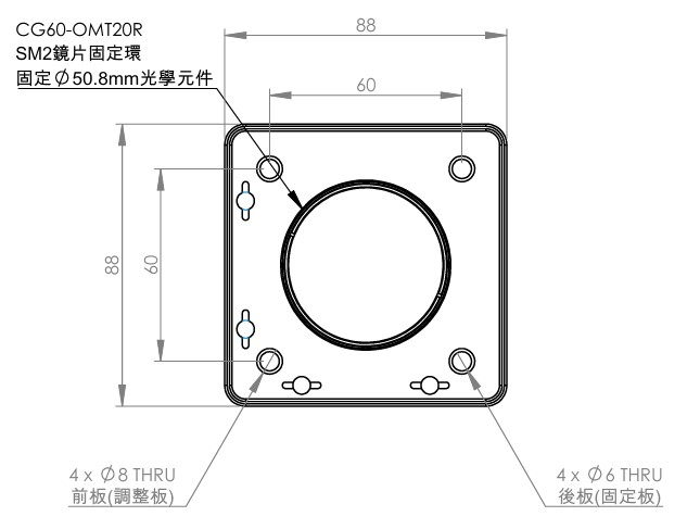 - CG60-OMT2R: 60mm籠式0°入射鏡架附SM2安裝孔,內附SM2鏡片固定環固定光學元件,三軸可調;