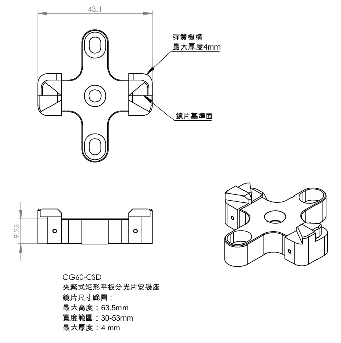 | CG60-CSD | 夾緊式矩形分光片安裝座 |